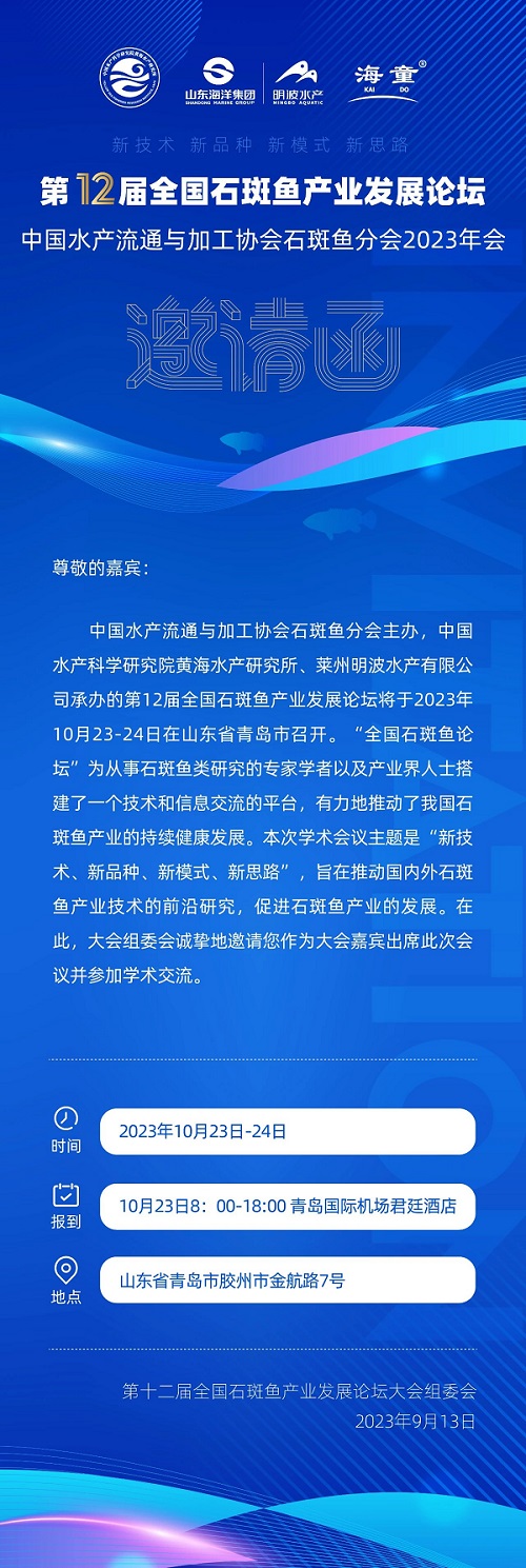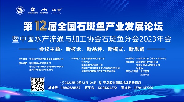 自2010年中山大学林浩然院士发起第1届“全国石斑鱼类繁育与养殖产业化论坛”以来,“全国石斑鱼论坛”延续至今,为从事石斑鱼类研究的专家学者以及产业界人士搭建了一个技术和信息交流的平台,有力地推动了我国石斑鱼产业的持续健康发展。由中国水产流通与加工协会石斑鱼分会主办的“第十二届全国石斑鱼产业发展论坛暨中国水产流通与加工协会石斑鱼分会2023年会”拟于2023年10月23-24日在山东青岛召开,论坛将围绕石斑鱼种业、饲料营养、病害控制、养殖技术、食品安全、冷冻保鲜和加工以及流通和消费等产业链关键环节,邀请院士、领军专家、企业家分享最新前沿技术成果,解析行业发展动态,探索石斑鱼产业发展方向。现将参会事宜通知如下: